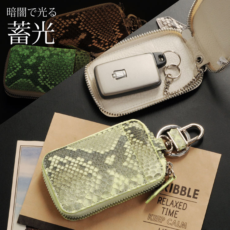 ダイヤモンド パイソン スマート キーケース メンズ 蓄光 ナチュラル/ピンク プレゼント パイソン柄 クリスマス ギフト 車 バイク (06001036-mens-1r)商品詳細 ●デザインラウンドファスナーで大事な鍵をしっかり収納できるスマートキーケース。内側と外側にカードホルダーもあるので、ICカード等の持ち運びにも便利です。●素材細やかなダイヤ型の斑紋が連続的に美しく並ぶダイヤモンドパイソンを使用しています。表面には外部からの光を蓄え、暗闇で発光する『蓄光加工』を施しています。●スタイルフックが付いているのでパンツのベルトループ等に取り付けることができます。暗闇で浮かび上がるパイソンが独特の存在感を放ちます。 サイズ 横幅7cm 縦幅11cm 厚み2cm 重量:約80g ※こちらの商品は、独自の方法により採寸しています。詳細は[サイズガイド]をご確認ください。 計り方によっては、表記サイズと誤差が生じることがあります。 商品詳細 素材表側:ダイヤモンドパイソン内側:牛革(本革) 原産国ベトナム(縫製) 内側収納・カードホルダー×2・リング付きキーチェーン×1 外側収納・カードホルダー×2・キーリング×1・フック×1 開閉ラウンドファスナー式 ギフト:ラッピング対応 品番:06001036-mens-1r お問い合わせの際は、コチラの品番をお伝えください 商品名:ダイヤモンド パイソン スマート キーケース メンズ 蓄光 ナチュラル/ピンク ※当店で使用している本革は全て本物の革を使用しています。その為、皮革の模様など掲載画面と異なる場合がございます。また天然皮革に関してはワシントン条約を元に適正に輸入された商品を販売しています。 ※使用上の注意本革は水分を嫌いますので、もし水に濡れたときには乾いた布で水分をふき取り、 直射日光をさけ、自然乾燥させてください。 ※革の取り扱いについて詳細は[皮革の取り扱い・保管の方法]をご確認ください。 ■ men's 男性用 めんず リング■ アクセサリー ギフト プレゼント ヘビ革 蛇革■ へび革 本革 スネーク Python 本皮■ レザー time1114