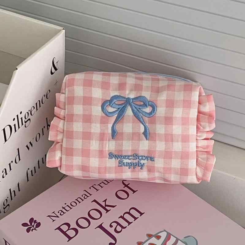 ポーチ レディース 格子柄 蝶結び 小物入れ コスメポーチ 大容量 刺繍 かわいい 旅行 化粧品 文具 収納 ピンク系 レッド系