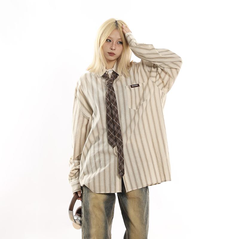 レディース シャツ 長袖 襟付き 半袖 ネクタイ アメカジ レトロ ストライプ ルーズフィット スクール風 ストリート カジュアル ビッグシルエット ポリエステル 春夏 トップス ブラウス 普段使い