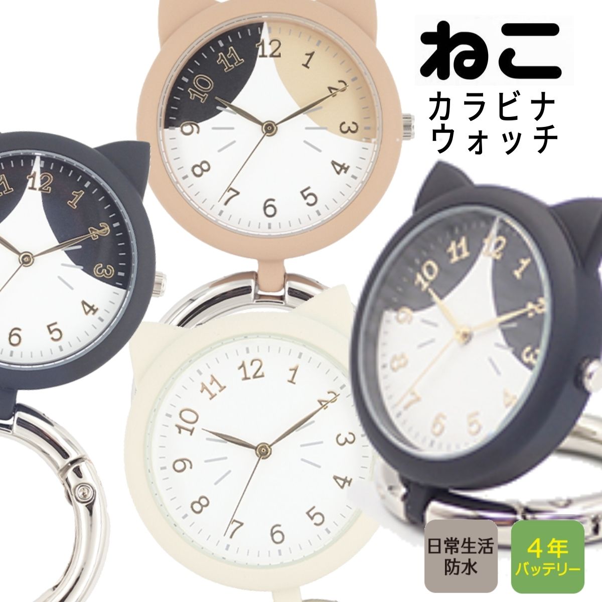 【送料無料◎猫カラビナウォッチ 日本製】 猫耳付き キーホルダーウォッチ 三毛猫 白猫 黒猫 黒ぶち ベージュ アイボリー おしゃれ かわいい 猫雑貨 猫グッズ ネコモチーフ ギフト 誕生日プレゼント プチギフト 時計 カラビナ付き【Xmas・クリスマス】