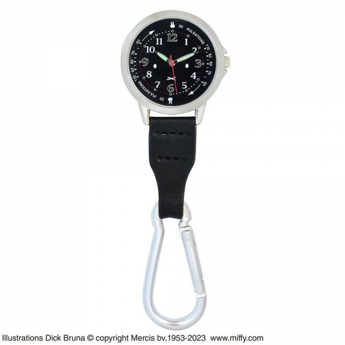 🎉 ミッフィー生誕70周年記念!限定デザインのナースウォッチ登場 🎉 ミッフィー生誕70周年を記念した限定デザインの懐中時計が登場! 歴代ミッフィーが集合した可愛い文字盤に、逆さ文字盤&蓄光針を採用。 医療現場や介護、看護師の方に嬉しい脈拍目盛付きで、夜勤や往診時にも使いやすい仕様です。 カラビナ付きでバッグやベルトループに簡単装着。 軽量&防水仕様で日常使いにも最適です。 \ ミッフィー カラビナ付き ウォッチ のここがスゴイ!/ 🔸 ミッフィー 70周年限定:歴代キャラクターが集合した特別デザイン 🔸 ナースウォッチ仕様:逆さ文字盤で付けたまま見やすい 🔸 蓄光針付き:夜勤や暗所でも時間確認がスムーズ 🔸 脈拍目盛付き:医師・看護師・介護士に便利な機能 🔸 カラビナ付き:バッグやベルトループに簡単装着可能 🔸 軽量&防水:3気圧防水で日常使いにも最適 ほかのカラビナ付きウォッチはこちらから!20回の脈拍を取ることで約1分間の脈拍を簡易的に知ることができる目盛付きです。カラビナが付くことで往診の際のバックに取り付けたり、ワゴンに取り付けたり、パンツのベルトホルダー等にも取り付けたりしやすくなります。逆さ文字盤にしていますので、自分から見た際に、見やすくなっています。短針と長針針には蓄光針を使用しています。【取り扱い注意事項】クォーツ式は磁気帯びに弱く故障の原因の一つと考えられています。磁気を発生する機器の近くで時計を使用している場合、磁気帯びが主な原因として考えられます。パソコンやテレビ、電子レンジなど、家電製品の中には強い磁気を発するものがあります。身近なものでは、スマートフォンなどもあり、これらが発する磁気が部品に影響を与え、突然時間がづれる、止まるなどの原因になっている場合があります。磁気帯びを防ぐためには下記に注意して下さい。・スマートフォンや関連商品と時計を一緒に置かない。・カバンの内ポケットには時計を入れない。・いろいろなモノといっしょに小物入れに保管しない。保管場所に気を付けて大切に使いましょう。時計が磁気を帯びた場合は、磁気抜き作業をしなければいけませんので、磁気を抜くための器具が必要になりますので、メーカーまたは、専門店へご相談下さい。サイズφ 3.6 × D 0.7 × H 11.7cm個装サイズ:8×14.5×1cm素材・材質(ケース)アロイ合金、(風防)ミネラルガラス(裏蓋)ステンレス、ミネラルガラス、(ベルト部分)合皮、(カラビナ)アルミニウム仕様1年間保証書付、電池:SR626(初回モニター用電池使用)、時間精度:平均月差15秒、表示方法:アナログ、防水機能:3気圧防水、動作温度範囲:5℃〜35℃生産国中国