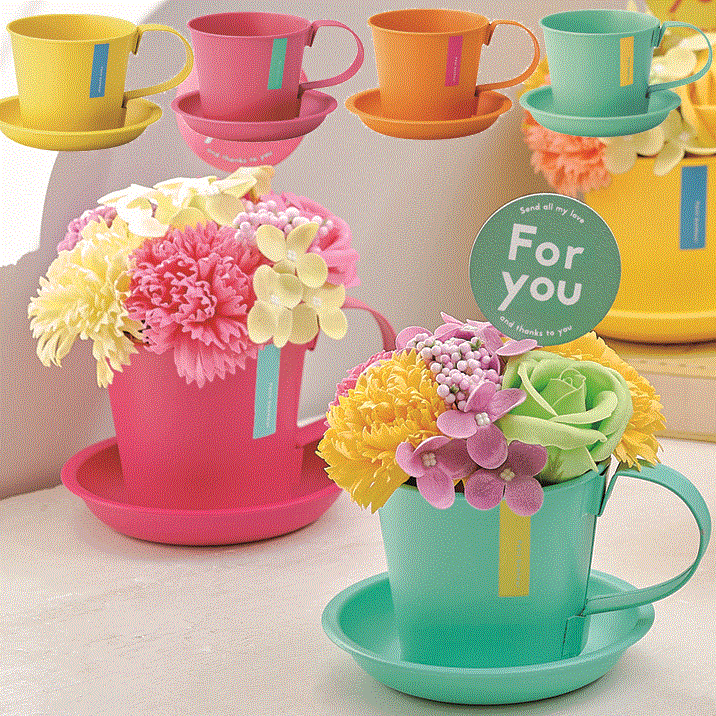 フラワーアレンジメント ポット 花器 ビビットカラーブリキ ティーカップ コーヒーカップ コンポート プランター ブリキ かわいい おしゃれ 2.5号鉢 ビビットラベルブリキ イエロー オレンジ ピンク グリーン プランターカバー 鉢カバー ブリキ鉢 植木鉢