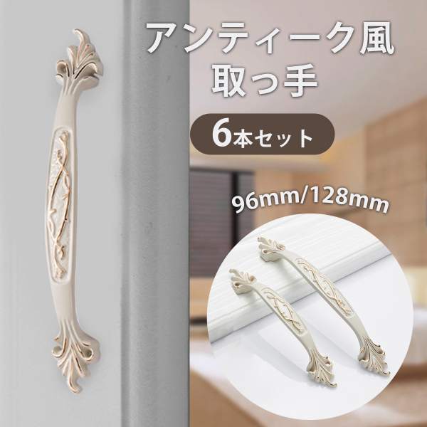 ハンドル 6本セット 6個 取っ手 つまみ アンティーク おしゃれ ホワイト 白 ゴールド 金 装飾 引き出し ドア 棚 タンス キャビネット DIY 96mm 128mm