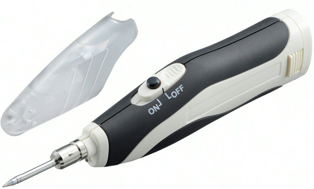 RoHS2適合品電池4本式ハイパワーコードレスはんだこて使用電源:単3乾電池×4本(別売)充電式ニッケル 水素電池使用可消費電力:9W標準こて先:B型(MSD-40HRT-B)連続使用時間:アルカリ電池約40分、ニッケル 水素電池約60分最高使用温度:450℃以上サイズ:全長222mm(キャップ除く)重量:68g(電池、キャップ除く)使用できる単3型電池の種類によっては径が太いタイプがあります。入りにくい場合があります。電池式コードレスはんだこて。電源の確保できないところで使用可能。 先端のLEDではんだ付け作業を明るく照らします。 工具不要でこて先交換できるアタッチメント式こて先。 急な電池切れによる作業中断を防ぐ電池切れお知らせランプ。 持ち運びに便利な、ストラップ穴付き スイッチ切り忘れ防止機能付き携帯キャップ付き。キャップにはんだを巻いて持ち歩くことも可能。