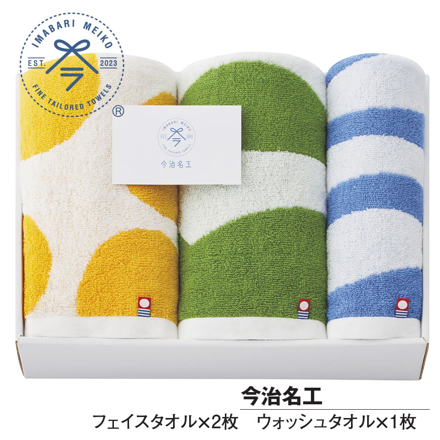 今治 今治名工今治タオル :第 2023-1643 号 今治タオルは、地域に脈々と育まれてきた確かな技術・経験に裏打ちされた品質と温もりに満ちたタオルです。温暖な気候と水に恵まれて発展した百二十余年の歴史と伝統を受け継ぎながら、日々技術開発に努める中で先進的な商品づくりに挑戦します。 【フェイス・ウォッシュタオルセット】 内容 フェイスタオル 33×80cm ×2ウォッシュタオル 33×34cm ×1箱サイズ 25×35×8cm 特徴 すこし、なつかしい。どこか、あたらしい。100年後も愛されるタオル。「すこし、なつかしい。」をフレキソ印刷の化粧箱で実現。 今治から連想される風景(島・水・みかん)をアートスタイルに視覚化。スリーブを引き出すと今治の風景が現れるようなイメージに仕上げています。化粧箱は3サイズをご用意しています。 化粧箱こちらの商品は、「水」すいりゅう 中箱でのお届けとなります エコマーク認定番号 第 19104077 号人や環境にやさしく作っております。苛性ソーダや塩素、蛍光増白剤を一切使用しないエコロジーな加工を施しております。 素材 綿100% 原産国 日本 販売・製造元 マツイコーポレーション株式会社 ギフトラッピング 想いを込めたラッピング無料で承ります♪贈り物で大変喜んでいただいてます。メッセージカード、のし など、ご希望のギフトオプションを提供しております。大切な人へのギフトは、カデココにお任せください!【結婚祝い】二人の門出を祝って贈りたいプレゼント結婚祝い・結婚内祝い・二次会・ビンゴ・抽選会・景品などのイベントにあったプレゼント・贈り物【出産祝い】赤ちゃんが生まれた時に贈りたい出産祝い・ 男の子・女の子・出産内祝い・産休・プチギフト【誕生日・記念日】一年に一度、誰もが迎える大切な日に贈りたい誕生日・彼氏・彼女・夫・妻・結婚記念日・サプライズ【引越・新築祝い】大切な人の新しい暮らしをお祝いする新築マンション・新築一戸建て・新築祝い お返し【昇進・定年祝い・退職祝い】お世話になった方の昇進や定年祝いに贈りたい父親・母親・兄弟・子供・友達へ・仕事仲間へ【母の日】【父の日】【敬老の日】【還暦祝い】【バレンタイン】【ホワイトデー】【クリスマス】【入学祝い】【卒業祝い】【成人祝い】【内祝い】【夏ギフト】【お中元】【お歳暮】【卒園 プチギフト】【卒園 プレゼント】【卒業 プレゼント】【退職 お礼 プレゼント タオル】【内祝い お返し】関連商品心を込めたラッピング♪無料(メッセージカード・熨斗も承ります) お祝い事への贈りものにタオルブランド「今治名工」 100年後も愛されるタオル。100年後も愛されるタオルを、お届けするために。美しいこと、心地よいこと、環境にやさしいこと、安心して使えること。それが私たちの約束です。今治名工のタオルは、美しく丁寧に仕立てられた洋服のように、日々の生活をより上質なものにします。いつの時代にも変わらない、大切なことをぶらさずに、織るひと、届けるひと、そして贈るひとの想いを載せて、きょうも、誰かの日常に寄り添っています。【サイズ】フェイスタオル×2枚:33×80 cm ・ウォッシュタオル×1枚:33×34 cm タオル3枚セット。ご予算にあわせて9種類のギフトセットをご準備しております。ご結婚の引き出物をはじめ、出産内祝や、各種内祝。お祝い、記念品からお中元やお歳暮などの様々なギフトシーンにお使いいただけます。 心を込めたラッピング♪無料(メッセージカード・熨斗も承ります)