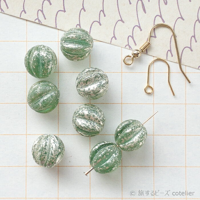 チェコビーズ 【10mm 8個】 グリーンシルバー メロン パンプキン ラウンド ガラス ビーズ 手芸 専門店 C1231