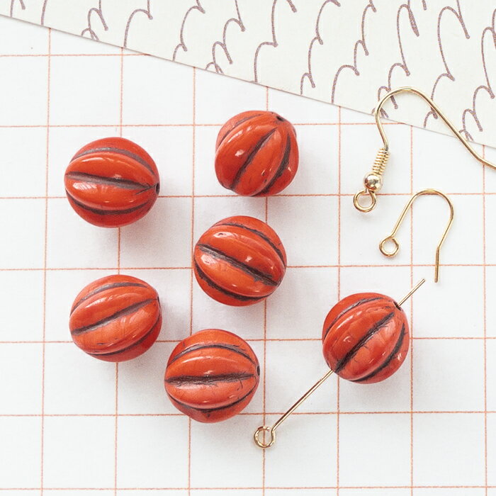 筋の入ったメロン・パンプキン型のラウンドプレスビーズ。チェコ製のガラスビーズです。※製造工程上、若干平たい形状も含まれます。 【サイズ】 12 ミリ (画像のマス目は1センチ四方です) 【個数】4個 【色味】不透明オレンジ。レッドや白っぽい部分もある色むら感のある色味です。ブラウン系コーティング。 【色違い】cotelier-melon 12mm 【サイズ違い】cotelier-melon 一覧 【穴の向き】縦 【材質】 ガラス製/チェコビーズ 【ご注意】 ひとつひとつ手作業を繰り返して作られるチェコビーズは色味や形に僅かながら微妙な差がございます。出来る限り画像に近いものからお届けしておりますが、チェコビーズの個性としてお楽しみ頂けますと幸いです。 またお使いのディスプレイ設定などにより実物と色味が若干異なって見えてしまう場合がございます。差の出易いパソコンよりもスマホでご覧頂くことをオススメしております。これに該当する交換や返品には対応できかねますので十分ご注意くださいませ。