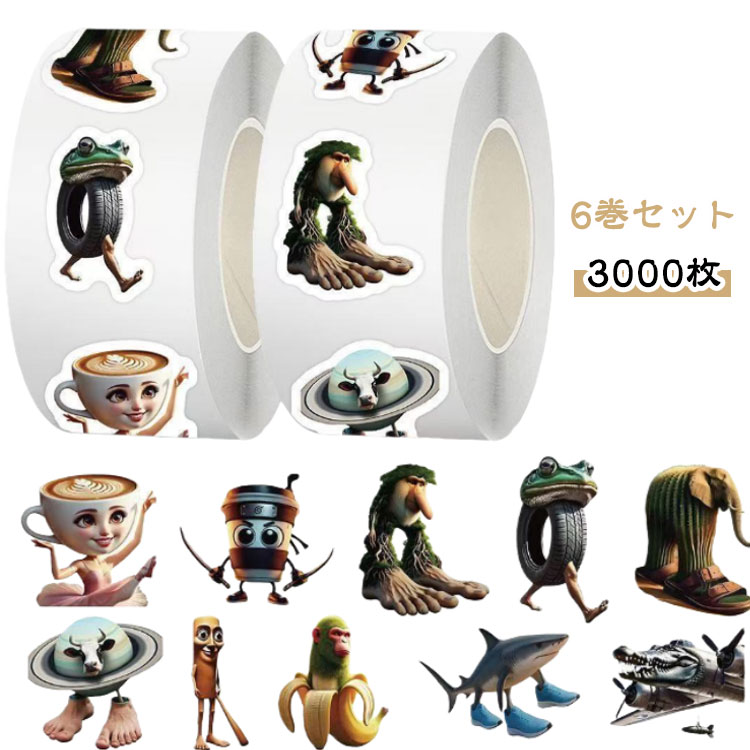 【6巻セット】イタリアンブレインロット シール ロールシール 3000枚 Italian brainrot 可愛い かわいい シール イタリアン ブレインロット グッズ ステッカー 手芸用品 DIY用 女の子 男の子 デコシール シール帳 手帳 デコレーション おもしろ