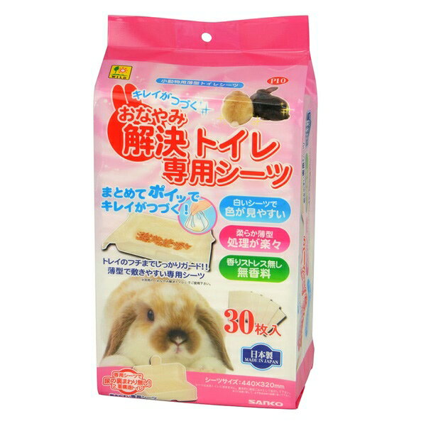 三晃商会の一覧はこちら おなやみ解決トイレにぴったりの専用薄型シーツ。おなやみ解決トイレの受けトレイのフチまで覆い、トイレの形状にフィットするサイズ感で敷きやすく、まとめてトイレゴミの処理ができてお手入れ楽々!毎日のトイレ使用に!【材質】□表素材/ポリオフィレン不織布□吸水材/綿状パルプ、吸収紙、吸収性ポリマー□防水材/ポリエチレンフィルム□結合材/ホットメルト□本体サイズ:シーツサイズ/440×320mm(30枚入り)□使用方法:ご使用には別売の「おなやみ解決トイレ専用シーツ」が必要です。□原産国または製造地:日本【諸注意】本品は、うさぎ等の小動物用トイレシーツです。他の目的には使用しないで下さい。ハサミ等で切らずにそのままご使用下さい。本品はトイレに流せません。ご使用後は焼却ゴミとして処分して下さい。(処理方法は各自治体の指示に従って下さい。)火気に近づけたり、直射日光が当たる場所の近くに置かないで下さい。幼児等が触れる場所に保管したり、本品で遊ばない様にして下さい。取り扱いには十分注意し、飼育者の管理の下、正しい状態で使用して下さい。本品を生き物が噛んだり、食べたりしないように十分注意し、スノコ等で防護できる場所で使用して下さい。使用中は製品や生き物の状態をよく確認し、危険を感じた場合は使用を中止して下さい。使用状況をよく観察し、こまめに取替えて飼育環境の衛生状態を保つようにして下さい。生き物は、種類や体格(体のサイズや年齢等)、性格に個体差があり、予測不可能な行動を起こしたりします。飼育者(管理者)は、生き物の行動や習性をよく理解して、よく観察し、本品の使用範囲を超えそうな場合は直ちに使用を中止して下さい。飼育用品は、100%安全な環境を提供できるものではありません。生き物は成長によって大きさや性質が変化したり、各個体によっても性格が異なります。更に四季を通して取り巻く環境が様々に変化します。大切なペットの安全な飼育環境を常に保てるようにして下さい。飼育時に於ける事故等に関しましては、責任を負いかねますので、予めご了承下さい。JANCD:4976285251009【銀行振込・コンビニ決済】等前払い決済予定のお客様へ当商品は弊社在庫品ではなく、メーカー在庫品です。在庫確認後に注文確認を行い、お支払いのお願いを送信させて頂きます。休業日、14:00以降のご注文の場合は翌営業日に上記手続きを行います。お時間が掛かる場合がございます。