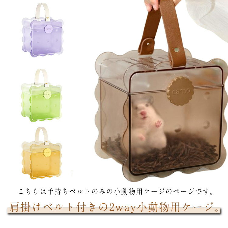 こちらは手持ちベルトのみの小動物用ケージのページです。 肩掛けベルト付きの2way小動物用ケージ。 【持ち手があるから一緒にお出かけできる】 軽量コンパクト、シンプル設計なので使い勝手〇 おでかけ、通院、災害時の移動にも最適です。 【クリア素材なのでいつでも様子が見れる!】 側面はクリア素材なので、いつでも様子を見ることができ安心です。 前面と背面はマット加工しているのでプライバシーを守ります。 【蓋が大きく開くのでふれあいやすい!】 蓋が大きく開くので、いつでもどこでもペットに餌やりや触れ合うことが出来ます。 【給水ボトル付きだからおでかけも安心!】 給水ボトル付きなので、長時間のお出かけも安心です。 【通気口があるので通気性抜群!】 上部に通気口があるので、通気性抜群◎ ケージの中に空気が滞ることがないので安心快適です。 【安全ロックが付きなので脱走する心配なし!】 安全ロックがついているので脱走する心配はありません。 回すだけで簡単に開閉が出来るのでお子様も安心して使えます。 【シンプルなデザインなのでお手入れが簡単!】 シンプルなデザイン、蓋が大きく開くので掃除がラクチン! 清潔な状態を保つことが出来ます。サイズ給水ボトル無し 給水ボトル付きサイズについての説明サイズ:200*200*160mm 測定方法によって誤差が生じますので、予めご了承下さい。素材PC PET PP色イエロー グリーン ブラウン パープル備考サイズ詳細等の測り方はスタッフ間で統一、徹底はしておりますが、実寸は商品によって若干の誤差(1cm〜3cm )がある場合がございますので、予めご了承ください。 製造ロットにより、細部形状の違いや、同色でも色味に多少の誤差が生じます。 パッケージは改良のため予告なく仕様を変更する場合があります。 ▼商品の色は、撮影時の光や、お客様のモニターの色具合などにより、実際の商品と異なる場合がございます。あらかじめ、ご了承ください。 ▼生地の特性上、やや匂いが強く感じられるものもございます。数日のご使用や陰干しなどで気になる匂いはほとんど感じられなくなります。 ▼同じ商品でも生産時期により形やサイズ、カラーに多少の誤差が生じる場合もございます。