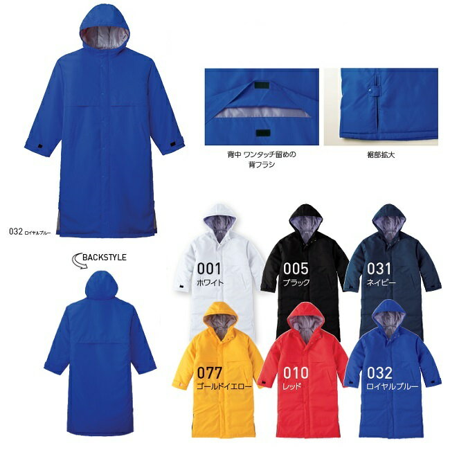 ■ロング中綿コート【S〜LL】 雨や風、そして寒さから身を守るロング丈、裾スリット入りで動きやすさも兼ね備え、軽い中綿を使用したロングコート。 寒い季節の屋外競技のベンチウォーマーやチームコートとしてご利用頂いてます。 キッズ・ジュニアサイズから展開してますので、スポーツ少年団などジュニアチームで揃えることも出来ます。 ※ベンチレーション有り ※フード有り(取り外し不可) ※ポケット有り(サイド+内側) ※サイドスリット有り ※フード調節ひも有り ※フードひも通し穴有り 【オリジナルプリント・刺繍対応商品】 プリント加工・刺しゅう加工ともに追加料金が発生します。 ※ご注意ください お客様ご注文時に追加料金分は自動決済にはなりません。 当店確認時に追加請求させていただきますので予めご了承ください。 メールにて金額変更のご連絡を差し上げますので必ずご確認ください。 (通常のお届け+1週間程お時間がかかります) ・ネーム加工:小/ ¥880 - (刺繍¥990-) (税込) ・ネーム加工:大/ ¥1,320 - (刺繍¥1,820-) (税込) プリント加工は「高熱圧着」となります。 通常のお洗濯では問題ありませんが、乾燥機使用不可です。 乾燥機使用をされる場合は刺しゅう加工をおすすめいたします。 〔素材〕 ・表地:ナイロン100% ・中綿:ポリエステル100% ・裏地:ポリエステル100% 〔サイズ〕S ・M ・L ・LL ■キッズ・ジュニアサイズ(110〜150) 〔カラー〕ネイビー・ブラック