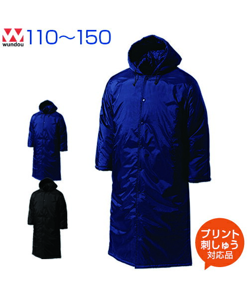 ロング中綿コート【アウター】【wundou(ウンドウ)】ジュニア 110.120.130.140.150 (オリジナルプリント対応) ロングコート ベンチコート 名入れ 無地 シンプル イベント スタッフ 選手のベストコンディションを維持 登下校にも フード(ひも無し) ネーム刺繍