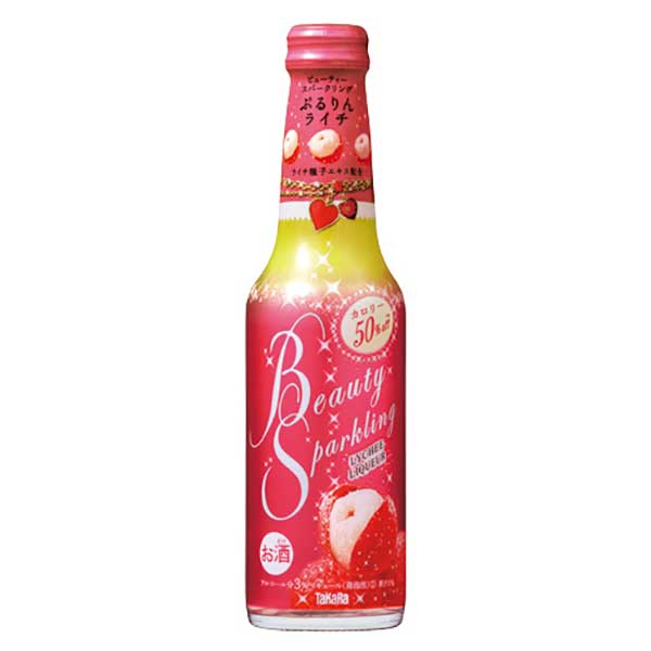 TaKaRa「BeautySparkling」 ぷるりんライチ 250ml 12本 女性に人気!カロリーもうれしい50%オフの壜入りスパークリングドリンク。 華やかで上品な香りが特徴の台湾産ライチ果汁に、美容成分「ライチ種子エキス」をプラスしました。 おいしく飲んで、ぷるり〜んキレ〜イ♪ 商品説明 商品名 タカラ ビューティスパークリング ぷるりんライチ 原材料 アルコール度 3% 内容量 250ml 12本 製造元 宝酒造株式会社 保存方法 直射日光や高温多湿の場所をさけて 保存してください。 栄養成分表示(100mlあたり) エネルギー 24Kcal たんぱく質 0g 脂 質 0g 食物繊維 1.3g 食塩相当量 0mg 糖 質 1.4g アレルギー特定原材料 - 250ml瓶×12本 入りです。 ※ケースでのご注文となります。 この商品は2ケースまで同梱包でお送りできます。