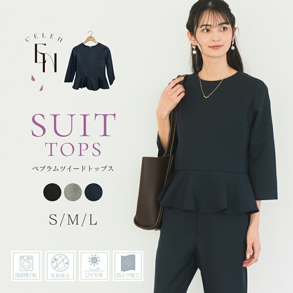 ■ペプラムツイードトップス 2025COLLECTION 気になる腰回りを自然にカバーするペプラムデザインでスタイルアップを叶え、女性らしい印象を与えるレディーストップス。 七分丈の袖で爽やかな印象のペプラムツイードトップスは、オフィススタイル・フォーマルスタイル・お出かけスタイル・カジュアルスタイルすべてにぴったり。 オフィスシーンではシンプルできちんとした印象になり、入学式(入園式)や卒業式(卒園式)などの特別な行事にも着回しやすいのが嬉しいトップスです。 きちんと感と柔らかい女性らしさを持ち合わせ、単品ではもちろん、セットアップとして組み合わせても楽しめるアイテムです! 【Color variation】 ・Black ・Charcoal ・Navy ※ディテール画像は撮影のためライトを強く当てております。 実際のお色味はモデル着用画像をご参考ください。 【Point】 ・スタイルアップを叶えるペプラムデザイン! ウエスト位置のペプラムデザインによる切り替えで気になる腰回りをカバー。 手首の見える七分丈の袖で大人のこなれ感を演出します。 スッキリとしたネックラインはどんなネックレスとも相性抜群で、後ろはコンシールファスナータイプなのでスムーズな着脱が可能です。 ・軽やかで通気性に優れたサマーツイード素材! 軽くて薄手な生地を採用しているため、夏でも快適に着ることができます。 立体感と織り目の美しいサマーツイード素材で、春や秋口にも適応できる柔軟性を持ちつつ、通気性が良いのでストレスなく過ごしていただけます。 ・ご家庭で洗濯機洗い可能なイージーケア&充実の機能性! ウォッシャブル素材なので常に清潔な状態を保つことができます。 また、UVカット、花粉防止、防シワ加工付きで、季節を問わず快適に着用可能です。 同シリーズでツイードテーパードパンツ(品番:DF30012)も展開しているので上下別色・上下別サイズで組み合わせを楽しんだり、同色・同サイズでセットアップスタイルを楽しみたいならサマーツイードトップス・パンツセットアップ(品番:DF00012)がおすすめです♪ ■2025COLLECTION 「機能性UP!王道スーツ」をテーマに、どんなシーンでも使いやすいスーツの型に機能性をプラスしました。 ご自宅で洗えることはもちろん、あったら嬉しい機能も兼ね備えた、お手頃な価格で手が届く普段使いしやすいスーツアイテムをお届けします。 単品でもセットアップでもコーディネート自由自在な、日常に溶け込みやすいスーツです。 ■CELENスーツ ビジネススタイルから休日のカジュアルシーン、ちょっとしたフォーマルやセレモニーシーンまで幅広く活躍し、様々な着回しを楽しめる汎用性にこだわった大人のオールシーズンスーツ。 きちんと感と抜け感のバランスが取れた、清潔感のあるスタイルをご提案します。 忙しい日々も自分らしく輝きたい、働く女性やママさんにおすすめ。着こなしをぜひお楽しみください。 【サイズ】 ・Sサイズ 着丈 53.5cm バスト 90cm 肩幅 35cm ウエスト 80cm 袖丈 44cm 袖幅 16.8cm 袖口幅 15cm 重量 196g ・Mサイズ 着丈 54.5cm バスト 94cm 肩幅 36cm ウエスト 83cm 袖丈 45cm 袖幅 17.4cm 袖口幅 15.5cm 重量 202g ・Lサイズ 着丈 55.5cm バスト 98cm 肩幅 37cm ウエスト 86cm 袖丈 46cm 袖幅 18cm 袖口幅 16cm 重量 214g ポリエステル 100% 【加工機能】 本製品にはUVカット加工、花粉防止加工、防シワ加工が施されておりますが、効果を維持するために以下の点にご注意ください。 ・UVカット加工 洗濯回数が増えると、防止効果が弱まる場合がございます。長時間直射日光にさらすことはお控えください。 ・花粉防止加工 効果は使用状況により異なります。洗濯や使用を繰り返すことで、加工の効果が薄れる場合がございます。 ・防シワ加工 強く折りたたむと、シワがつく可能性がございます。洗濯後はすぐに形を整えて干してください。 【お手入れ】 ・洗濯又はクリーニングの際は、裏返してネットをご使用ください。 ・洗濯の際は、もみ洗いはせず必ず押し洗いをして下さい。 ・多少色落ちしますので、洗濯又はクリーニングの際、白色・淡色のものとは分けて洗ってください。 ・淡色製品の場合は、蛍光増白剤の含まれていない洗剤をご使用ください。 ・この製品を上下のセットアップで着用する場合は、必ず同じ方法で洗ってください。着用頻度や洗濯回数の違いによっては、上下に色差が生じることがございます。 ・クリーニング後の乾燥は低温乾燥でお願いいたします。 ・着用による摩擦で、衣服や他のものなどに色移りすることがございます。白色・淡色とのコーディネートをする際は、十分ご注意下さい。 ・強い日光や照明に長時間当たりますと、変色する場合がございます。暗所での保管をお願いいたします。 ・着用中の摩擦や洗濯、クリーニングにより、毛羽立ち・ピリング(毛玉)が生じる場合がございます。毛玉を取り除く際は、糸を傷つけないよう小ばさみや毛玉取り器等をご使用ください。 ※注意事項※ ・生産時期により色味や柄が若干異なる場
