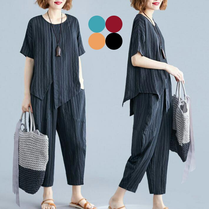 綿麻2点セット セットアップ リネン トップス パンツ サルエルパンツ 半袖 アシンメトリー フィッシュテール ウエストゴム レディース トップス ボトムス オーバーサイズ 大きいサイズ 夏