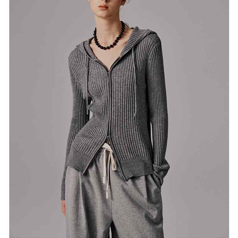 ニット レディース カーディガン ウール ジップアップ パーカー フード付き トップス 長袖 無地 カジュアル 秋冬 グレー ブラック オフホワイト
