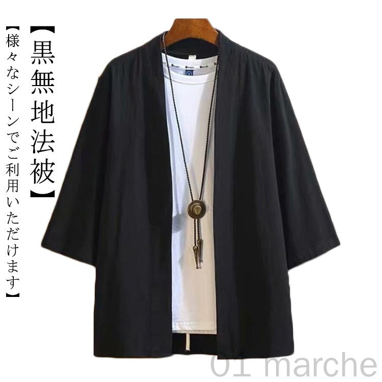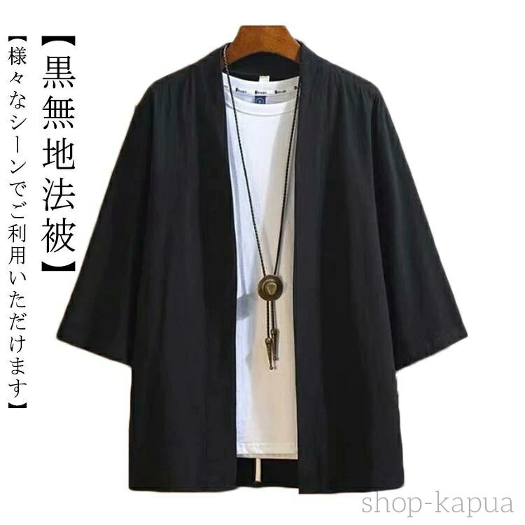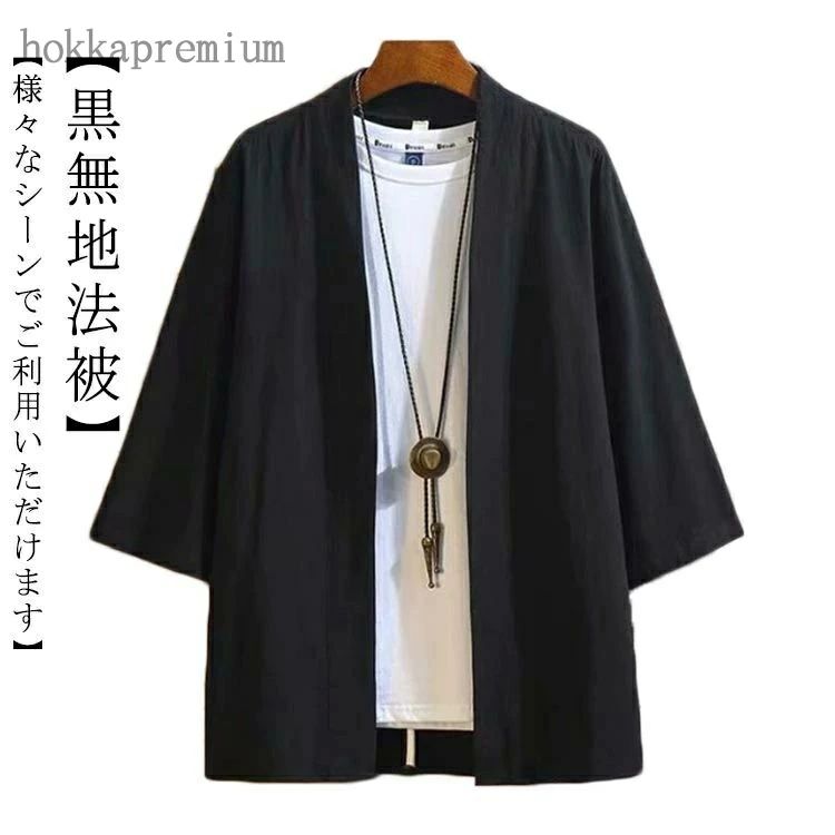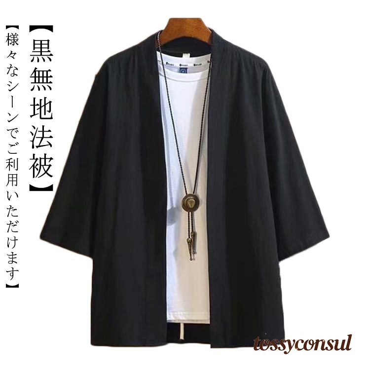 商品情報 サイズ 身丈:82cm身巾:64cm袖巾:36cm袖丈:50cm袖口:22cm衿巾:6cm 対象サイズ 身長:155〜190cm 素材 ポリエステル100% 生地 綾織 色 ブラック 黒 柄 無地 特徴 角袖・身八つ口 ・商品画像の光加減・web環境等により、色味の誤差・イメージ違い等、ご了承くださいますようお願い申し上げます。 ・クリーニング店での水洗いをお勧めします。 ・色落ち等の原因になります為、蛍光増白剤の入っていない洗剤をご使用下さい。 ・長時間の水への浸漬はお避け下さい。 ・洗濯により、加工部分のほつれが助長されることがありますので、ご了承下さい。シンプルでスタイリッシュな「羽織(はおり)」の登場です。 イベントからタウンユースまで 幅広いシーンでご利用いただけます。 和を演出する[角袖(かくそで)]仕立て ゆったりとした着心地と 袂のある「角袖(かくそで)」で 和のスタイルをお楽しみいただけます。 袖付は通気性を考慮し[身八つ口]仕立て 動きやすさの向上と、熱がこもらないよう通気性を出す為に 「身八つ口」を採用しています。 シンプルなデザインなのでコーディネートしやすく ユニセックスでご着用いただけます。 柔らかく肌触りの良い[綾織(あやおり)]生地 動綿の風合と軽さを兼ね備えた 弊社オリジナルのポリエステル生地です。 綾織特有の斜文(斜めの織り目)が特徴。 平織生地とは異なり、柔らかく肌触りが良いので 着心地も軽やかです。 2