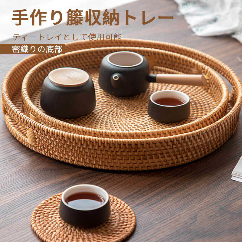 お買い物マラソン【P5倍】手作り籐収納トレー 手織りの収納トレイ 円形トレー 手編み 菓子皿 果物トレイ 小物入れ 小物置き お菓子入れ 籐製 トレイ 収納トレイ 丸型 手織り 安全 耳付き ハンドル付き インテリア雑貨 収納雑貨 手織り