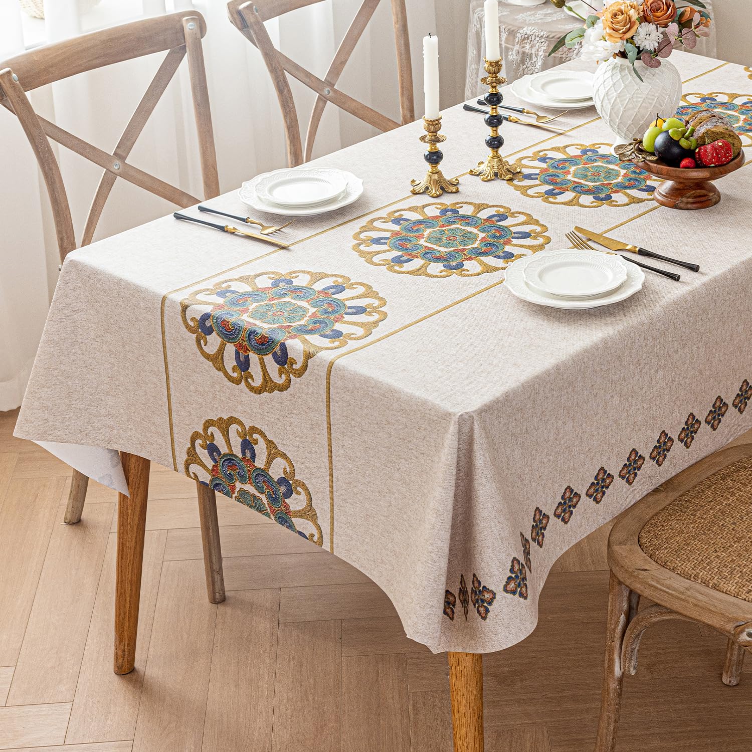 ・【商品情報】サイズ:約140×240cm、重量:約0.98KG。特徴:撥水防油耐久耐熱厚手、北欧風のテーブルクロスで、テーブルの上に敷くだけ、食卓の雰囲気がパット華やかにになります。・【優れた防水・防油性能】テーブルクロス生地に撥水加工を施しているので、汚れに強く、飲み物や醤油などをこぼしてしまっても染み込まない。雑巾で拭き取るだけでOK。お子様がいる家庭でも安心して使えます。・【優れた耐熱耐久性】耐熱温度は最大120度になり、耐久性に優れており、長時間の使用が可能です。生地が簡単に切れるから、好みの長さにカットして調節できるテーブルカバーです。・【ズレにくい上質な生地】生地は80%PVC+20%ポリエステルの合成生地で、丈夫さと柔らかさのバランスがよいです。また程よい重さがあり、机に敷いても簡単にずれにくく、テーブルを傷や汚れからちゃんと守ります。・【お手入れ簡単】PVCを使用している為軽くて布製品がない撥水、撥油、防汚、防カビ機能を持つ、洗濯の必要がありません、雑巾で拭き取るだけで、お手入れ簡単です。毎日の洗濯やアイロンがけの面倒さから解放され、またクリーニング代もかからず経済的です。