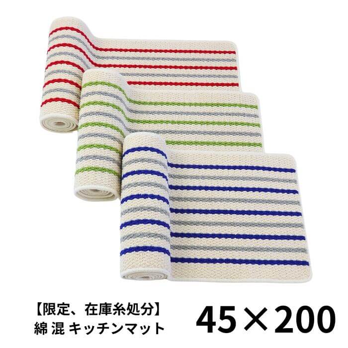 夏におすすめ。 さわやか綿混。在庫糸処分でお得、リサイクル糸を使用ナチュラルボーダーのキッチンマット ※無くなり次第終了となります。 キッチンマットを涼しくしたい、それなら夏にふさわしい天然系の素材のマットに変えられてみては?そこでこの夏を快適に過ごすために綿混のリサイクル糸を使ったキッチンマットをご用意いたしました。実はこの前まで展開していたお買い得、糸処分シリーズの後継版です。色糸の在庫量にばらつきがあるため、改めてデザインをしました。原料があとわずかの為、1ロット限りで終了となります。 ● ブルー シンプルなボーダー柄は夏に最適です。 ベージュ基調でとてもナチュラルです。 ● グリーン 差し色のグレーで空間が引き立ちます。 『踏み心地』にこだわってます。綿混素材なので吸水性と嵩高性や弾力性に富んでいます。バスマットや洗面台マットにもおすすめのマットです。 ● レッド 差し色のグレーで空間が引き立ちます。 『踏み心地』にこだわってます。綿混素材なので吸水性と嵩高性や弾力性に富んでいます。バスマットや洗面台マットにもおすすめのマットです。 製品を見て頂いて『綿か綿混リサイクル糸、どっち?』と質問したら、、、ナチュラルなビジュアル、ループパイルのふんわりした肌触り。正直なところ正解するのは難しいと思います。コットン系のリサイクル糸は綿の持つ吸水性に、ポリエステルやアクリルの嵩高、弾力性、レーヨンの光沢感など良いところがブレンドされた素材でもあります。価格もこなれていて夏場の暑い日におすすめです。 周囲は当店こだわりの【2回縫製】 当店は『10cm単位サイズ』にこだわってます。そこからご希望によりカット加工で、あなたのサイズを実現いたします。 イージーオーダーのご依頼はこちら。 キッチンのサイズは様々ですよね。足りなかったり折り曲げて使うのでは悲しすぎます。 お洗濯の事を考えて長いのが気になるお客様はカット加工で複数枚に切り分けるといったことも可能です。 ● 45cm( 規定の生地巾)をカットしたいなら、Aカット加工 をご利用下さい。 ● 長さをカット調整したいしたいなら、Bカット加工 をご利用下さい。 ● 形の変更などのご要望なら、【その他】加工指定 をご利用下さい。 サイズ45cm×200cm※10cm単位で選べます。カラーブルー・グリーン・レッド生地の厚み約8mm品質綿28% アクリル31% エステル35% レーヨン5% その他1%(リサイクル糸のため多少誤差があります)出荷予定日受注生産なのでご入金確認から営業日約3~4日で運送便にお引き渡ししています。到着まで約1週間程度です。その他裏面:滑りにくい加工洗濯機で丸洗い可(必ず洗濯ネットをご利用下さい。)※ドラム式洗濯機はおすすめしておりません。(洗濯機メーカーの取扱説明書をご確認下さい)※乾燥機(乾燥コース)使用不可 リサイクル糸の特性でお洗濯時に多少毛羽落ちがございます。 左の写真は2槽式洗濯機で【洗濯ネットなし】で洗った状態。洗濯時にパイルから脱落した毛羽が裏面に付着しています。これは洗濯ネットをご利用頂く事で多少は軽減します。(マットのお洗濯には必ず洗濯ネットをご使用下さい) お取り扱いのご注意