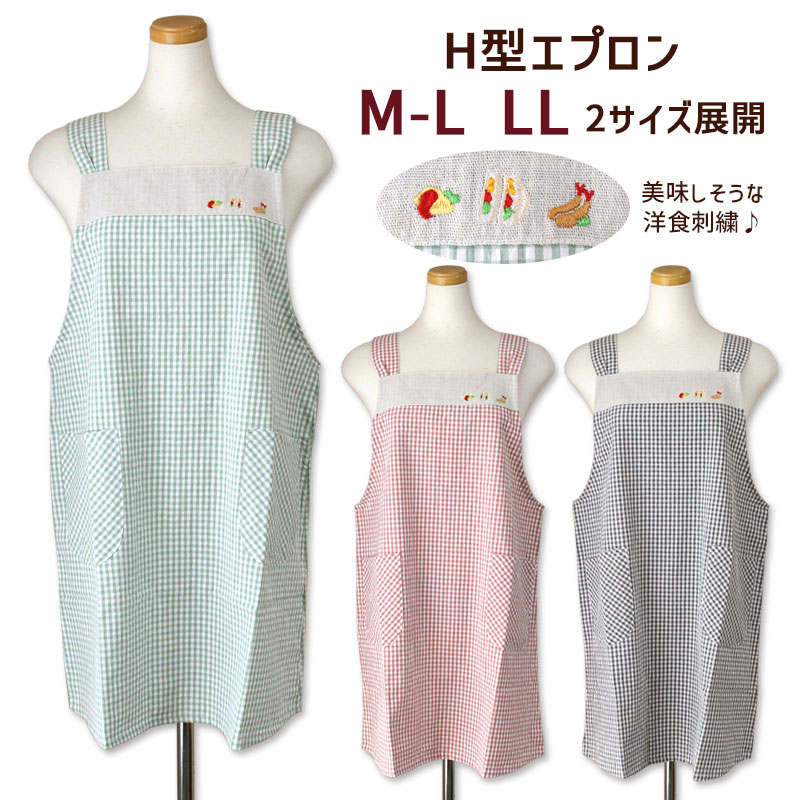 エプロン H型 洋食やさん 刺繍 M〜L LL 2サイズ K185-3 K185-4 ギンガム チェック 保育士 レディース おしゃれ 大きいサイズ サッカー素材 メール便可