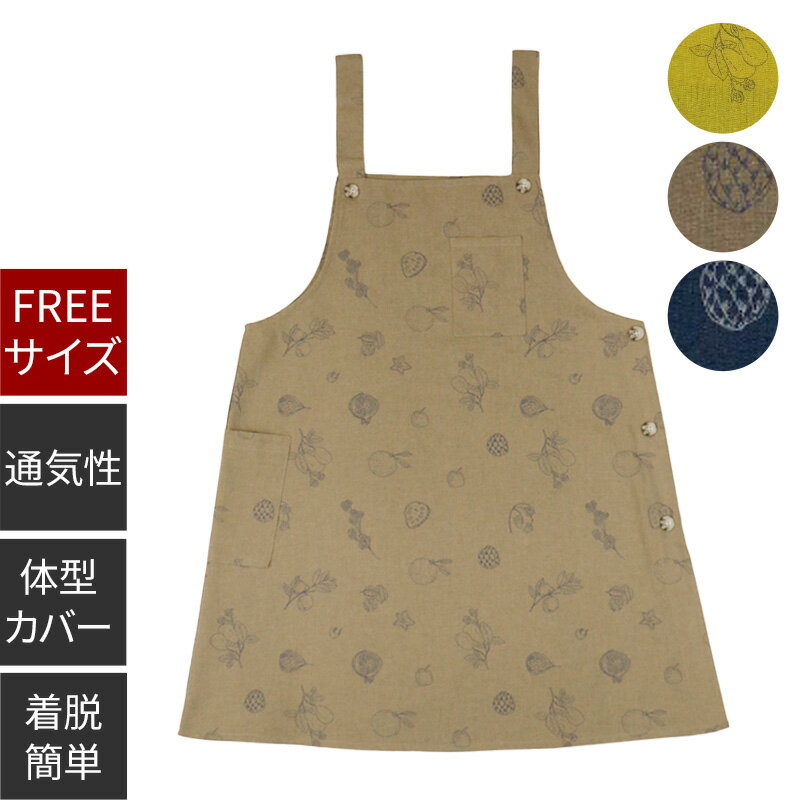 Aラインエプロン フルーツ柄 3色展開 お尻が隠れる 肩紐が落ちにくい 機能ポケット 体型カバー かわいい おしゃれ シンプル ワーク 着脱簡単