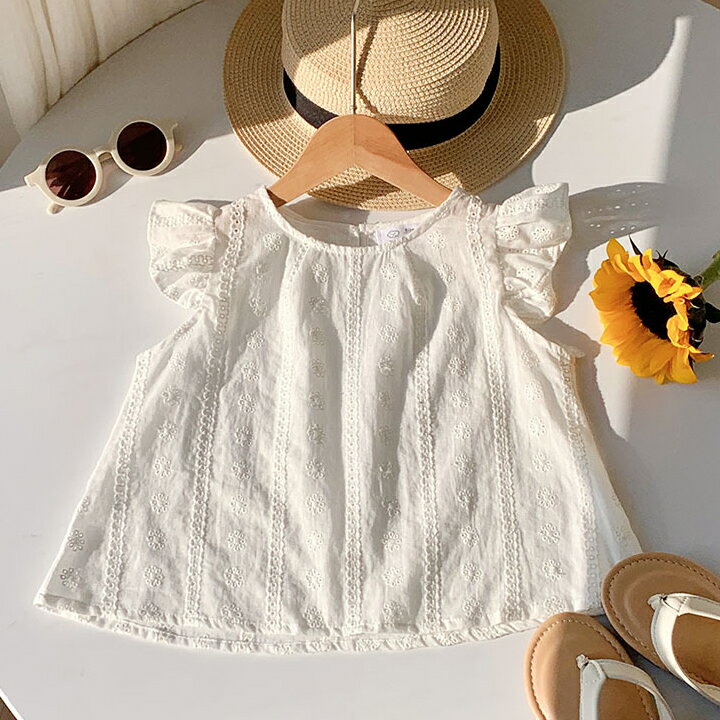 【即納】肩フリル ブラウス 刺繡 キッズ トップス 女の子 子供服 こども服 子ども服 プチプラ 無地 春 夏 100cm 110cm 120cm 130cm 140cm 通園 通学 プレゼント ホワイト