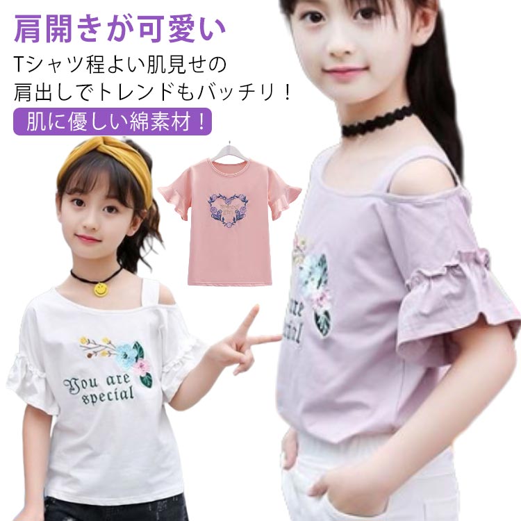 女の子 tシャツ 綿 半袖 夏服 韓国子供服 キッズ ブラウス 肩出し 肩開き オフショルダー カジュアル 女の子 カットソー 子供服 ベビー服 Tシャツ 可愛い おしゃれ スポーツウェア ジュニア おしゃれ 送料無料 110-120 130 140 150 160 170cm
