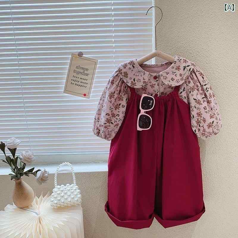セットアップ 女の子 女児 キッズ 春秋 韓国風 おしゃれ かわいい 2点セット サロペット オーバーオール 小花柄シャツ 長袖ブラウス 綿 コットン 柔らかい 長ズボン お出かけ 通園 普段使い 子供服