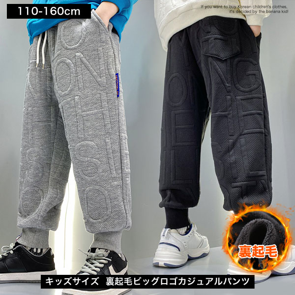 キッズサイズ 裏起毛 ビッグロゴ カジュアルパンツ フワフワ 保温性 ボトムス 子供服 子ども服 男の子 女の子 小学生 幼稚園 キッズ ジュニア 流行 かっこいい おしゃれ ジャージ スウェット パンツ あったかい 冬 110 120 130 140 150 160 ウエストゴム ブラック グレー