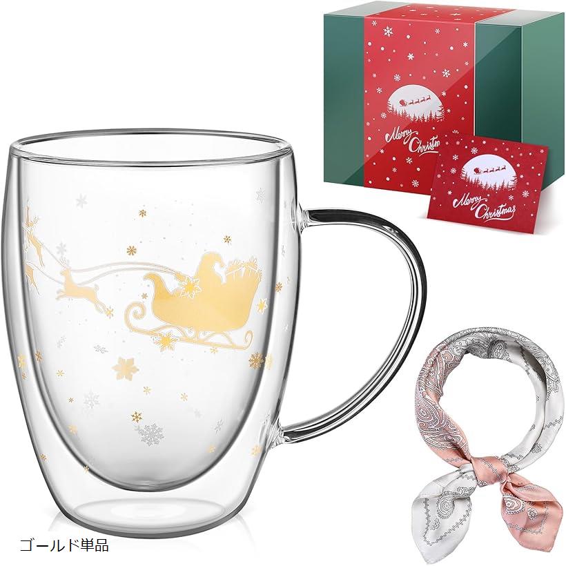クリスマス限定夜光サンタ 雪の ダブルウォールグラス かわいい プレゼント 女性 友達 彼女 娘 誕生日 クリスマスギフト スカーフセット 冬 贈り物 保温保冷 結露しない 食洗機対応 取っ手付き 350ml ボックス 入り (ゴールド単品)