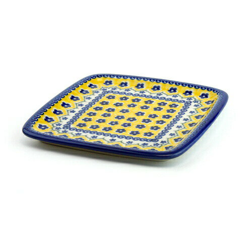 直径18cmのケーキにぴったり! お洒落な20cm四方の角皿。製造元での名称は「Dawid dessert plate」。ケーキを1台載せたりもできますし、小さなケーキを幾つか載せても取りやすく扱いやすいお皿です。ラウンドのプレートと共に使うことで、テーブルにアクセントが生まれ、スタイリッシュなセッティングを可能にしてくれる優れモノ。フラットなのでかさ張らず一枚あるだけでもとても便利で、絵画的な美しさもあるので使わない時には皿立てを使って飾っている方も多い素敵な1枚です。 日本で人気の深い黄色が基調色のパターンデザイン 濃い黄色とくっきりとした紺色のスタンプで構成された意匠は、ポーリッシュポタリーの多数派である藍色ベースの配色とはちょっと違った雰囲気です。緑色で縁取りされた白い部分がレースのように見え、この柄のお洒落なアクセントになっています。 商品詳細 大きさ 20cm×20cm 高さ 1.5cm Ceramika Artystyczna VENA(ヴェナ)社製