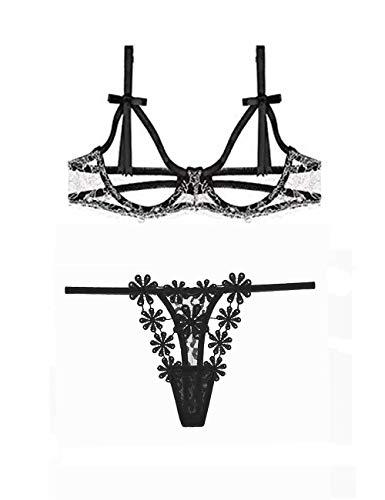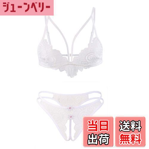 【送料無料】[qianqu] 女性オープンクロッチの視点メッシュ刺繍セクシーな下着穴あき ランジェリー下着セット 色:ホワイト-1、サイズ:M