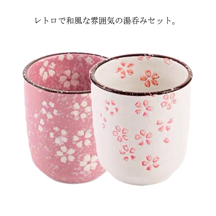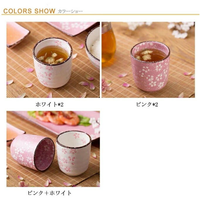 レトロで和風な雰囲気の湯呑みセット。模様の桜は職人さんが1つ1つ丁寧に柄付けしたもので、1つずつ表情が異なるところも手作業ならでは。フリーカップは、湯呑みとして使うのはもちろん、そばちょこなどとしても活躍するアイテム。おうち時間のおともにぴったりです♪クラシックの和風デザインなので、幅広い層の方にプレゼントとしておすすめです。 サイズ2個セットサイズについての説明底部直径4.5cm 口直径7.4cm 高さ7.8cm素材陶磁器色ピンク*2 ホワイト*2 ピンク+ホワイト備考 ●サイズ詳細等の測り方はスタッフ間で統一、徹底はしておりますが、実寸は商品によって若干の誤差(1cm〜3cm )がある場合がございますので、予めご了承ください。●製造ロットにより、細部形状の違いや、同色でも色味に多少の誤差が生じます。●パッケージは改良のため予告なく仕様を変更する場合があります。▼商品の色は、撮影時の光や、お客様のモニターの色具合などにより、実際の商品と異なる場合がございます。あらかじめ、ご了承ください。▼生地の特性上、やや匂いが強く感じられるものもございます。数日のご使用や陰干しなどで気になる匂いはほとんど感じられなくなります。▼同じ商品でも生産時期により形やサイズ、カラーに多少の誤差が生じる場合もございます。▼他店舗でも在庫を共有して販売をしている為、受注後欠品となる場合もございます。予め、ご了承お願い申し上げます。▼出荷前に全て検品を行っておりますが、万が一商品に不具合があった場合は、お問い合わせフォームまたはメールよりご連絡頂けます様お願い申し上げます。速やかに対応致しますのでご安心ください。