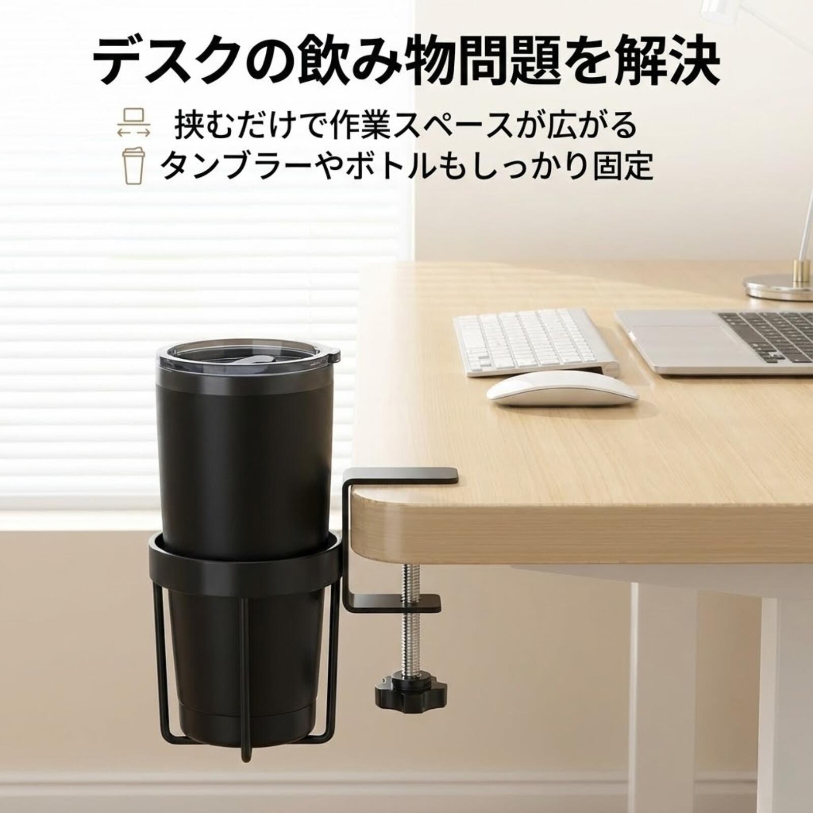 商品情報特長深さ10cmで「物理的に」倒れにくい一般的なデスク用ドリンクホルダーは、内径約八・五センチ・深さ五センチ前後のものが多く、背の高いカップでは重心が不安定になりがちです。本商品は深さ約十センチの深型設計を採用し、真空断熱タンブラーや六百ミリ以上のペットボトルでも、重心を低く保って転倒を物理的に防ぎやすくしています。ちょっとした接触やケーブルの引っ掛かりで倒れやすい環境でも、ドリンクの安定感を高めますPCやキーボードを守る「デスク外側」クランプ式デスクの外側に固定するクランプ式を採用しているため、万が一飲み物をこぼしても、PC本体やキーボード、書類へ直接かかるリスクを軽減できます。在宅ワークやゲーミング環境など、高価な電子機器が密集しているデスク周りで「水没故障」の不安を減らします工具不要・厚さ5cmまでの天板に対応強力なクランプで、天板の厚さ約五センチメートルまでしっかり固定可能です。工具は不要で、手回しネジを締めるだけの簡単取り付け。オフィスデスク、PCデスク、学習机、サイドテーブルなど、さまざまな家具に装着できます。クランプ部の接地面にはシリコンパッドを備え、天板へのキズつきや滑りを抑えます内径8.5cmのワイド設計で幅広い容器に対応カップ内径は約八・五センチメートルのワイド設計。コンビニコーヒー、紙コップ、ペットボトル、水筒、取っ手付きマグカップなど、一般的な飲料容器に広く対応します。飲み物だけでなく、スマートフォンやリモコン、文房具などを立てておけるサイドポケットとしても活用できますデスクスペースを最大化し、作業効率アップデスクの外側にホルダーを逃がすことで、天板上のスペースを広く確保できます。作業エリアにマグカップやペットボトルを置かなくて良くなるため、マルチモニター環境やゲーミング環境でもマウス・キーボードの可動域を妨げません。手元がすっきりすることで、書類作業やノートPC+外付けモニターなどのレイアウトも柔軟に組みやすくなります使用シーン在宅ワーク用デスクで、コーヒー・お茶・ペットボトルの定位置としてオフィスのパソコンデスクで、書類やキーボードへの飲み物こぼれ対策としてゲーミングデスクで、エナジードリンクや大きめ水筒をしっかり固定したいときに学習机やテーブル周りの小物収納ポケットとしてデスクすっきり ドリンクホルダー クランプ式 深型 内径8.5cm 深さ10cm デスク 机 挟む カップホルダー 紙コップ 水筒 ペットボトル タンブラー 小物入れ 転倒防止 深さ10センチの深型&クランプ式。デスクの外に飲み物を逃がして、PCまわりの転倒・水没を防ぐドリンクホルダーです デスクやテーブルの天板に挟むだけで使えるクランプ式ドリンクホルダーです。深さ約十センチの深型カップにより、背の高いタンブラーや大型ペットボトルもしっかりホールド。飲み物をデスクの外側に逃がすことで、こぼしたときにパソコンやキーボードへかかるリスクを抑え、作業スペースもすっきり保てます 5