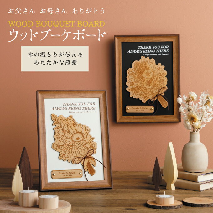 木の温もりが伝える、あたたかな感謝 この「咲き続ける花束」は親御様の変わらぬ「愛情」におふたりの「感謝」を伝え続けてくれます。 ●商品名/ウッドブーケボード(ホワイト・ブラック) ●商品サイズ/340×255×20mm ●加工方法/レーザー加工 ●置き掛けタイプ ●材質/樹脂(フレーム)、紙製(マット)、MDF(花束・プレート)、リボン(合皮) ■名入れ内容(名前・記念日)を注文確認画面の備考欄にご記入ください 例)名前/Daisuke&Yuko 記念日/Aug.5,2028 〈使用している木材について〉 使用している木材(MDF)は製木材であるため、個体差(黒い斑点模様など)がある場合がございますが、品質上問題はございません。 メーカー希望小売価格はメーカーカタログに基づいて掲載しています\ 両親贈呈ギフト こちらもオススメ /