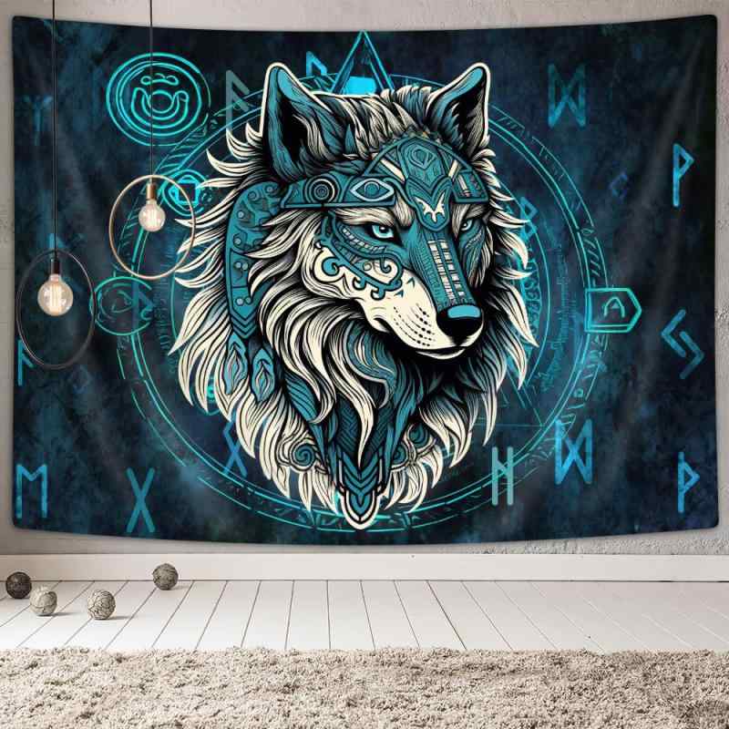 タペストリー ウォッシャブル 北欧神話 ヴァイキング ウルフ ルーン文字 中世 神秘動物 古代アート 古風 ブルー 壁掛け リビング 寝室 部屋飾り ポリエステル製