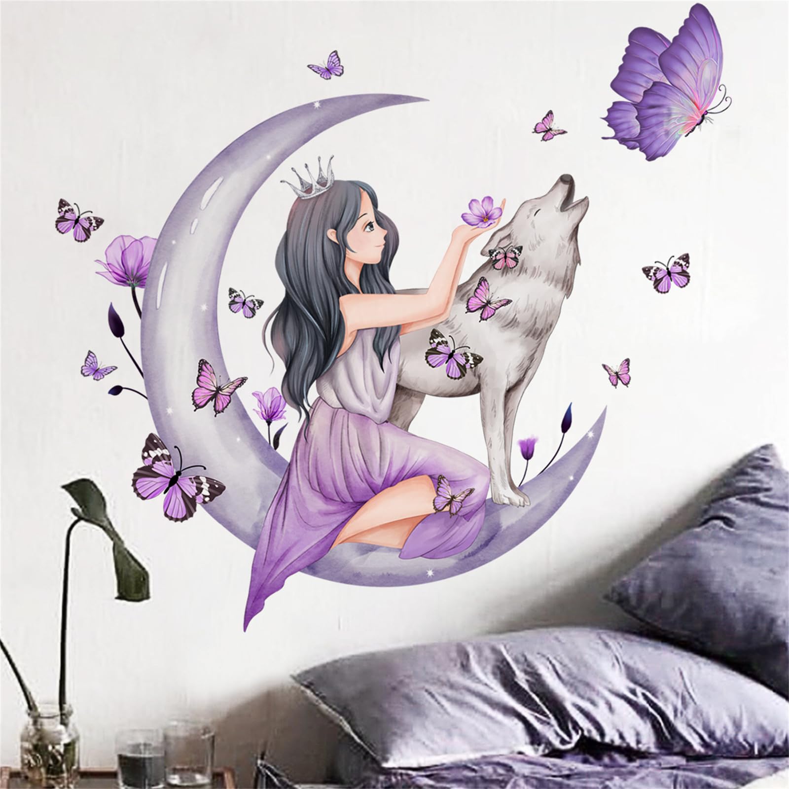 HOTIYOK ウォールステッカー 紫 花 蝶 ウルフ 月に座って女の子 ウォール シール デコ diy 壁紙 壁 シール 剥がせる 男の子 女の子 寝室 子供 部屋 ウォール ペーパー アート 保育園 はがせる wall