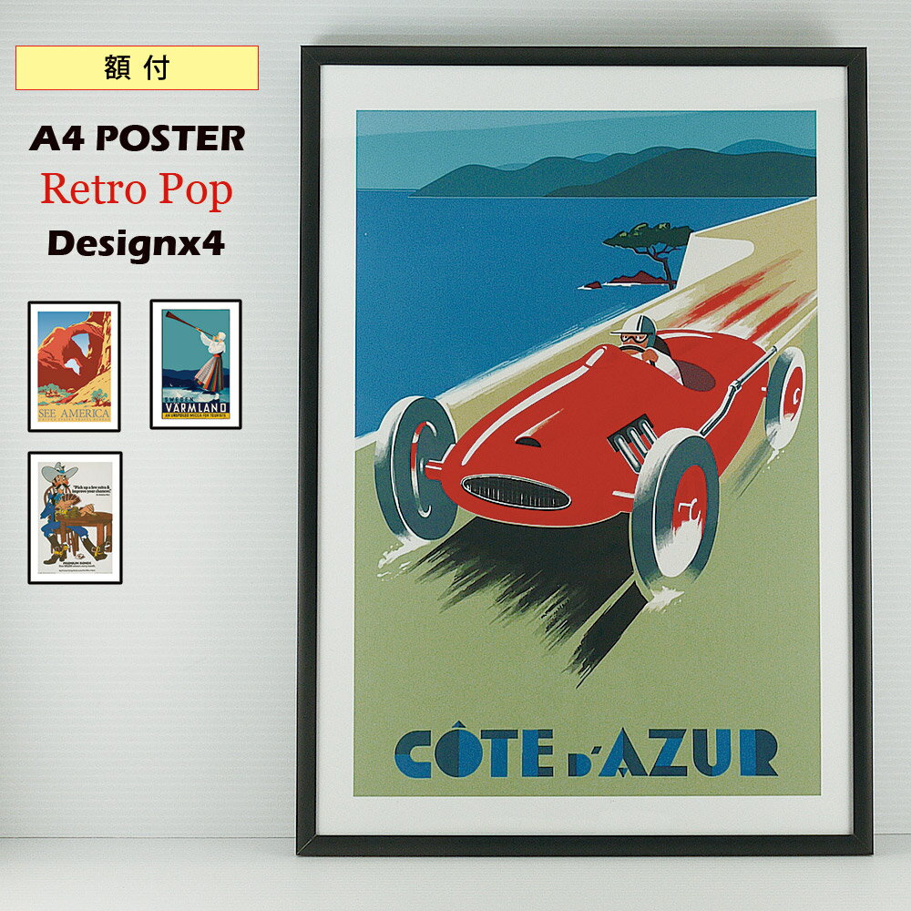 【額付】ポスターとフレーム(ブラック)セット レトロポップ アメカジ 北欧 全4種 アートポスター A4 214x300mm