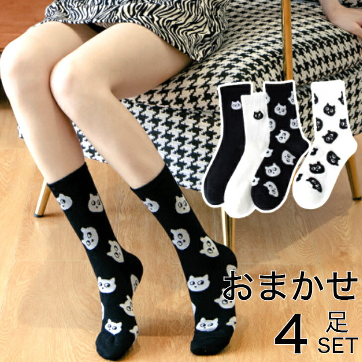 【おまかせ4足セット】靴下 レディース まとめ売り ねこ 猫 cat 動物 アニマル ソックス ミドルソックス 4足セット 春夏 春 夏 秋 かわいい おしゃれ まとめ買い お買い得 白黒 キュート ガーリー 韓国