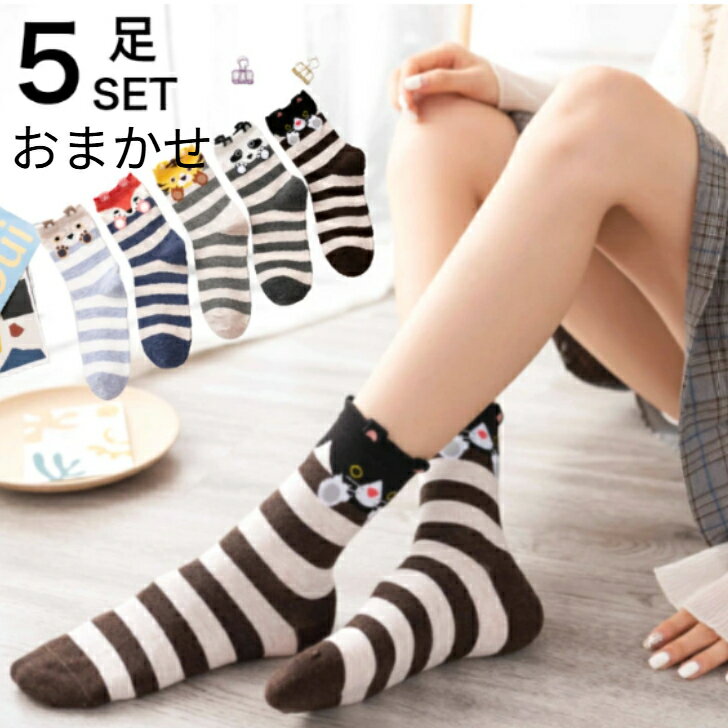 【おまかせ5足セット】靴下 レディース まとめ売り ソックス ミドルソックス 猫 cat 犬 パンダ キツネ トラ アニマル 動物 かわいい オシャレ まとめ買い お買い得 スニーカーソックス ミドル丈 クルー丈 オシャレ ルームソックス
