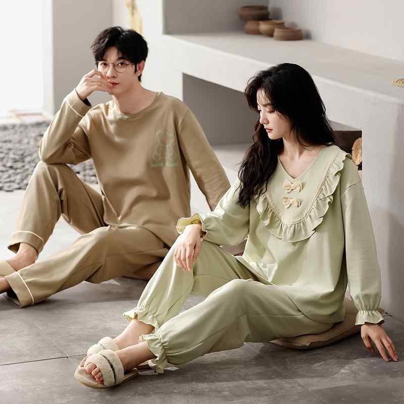 パジャマ レディース メンズ ペア おしゃれ セットアップ 上下 大きいサイズ コットン 長袖 長ズボン ウエストゴム プルオーバー ランドネック ポケット ルームウェア 部屋着 寝巻き 春秋 リラックス ゆったり 柔らかい クマ フリル リボン