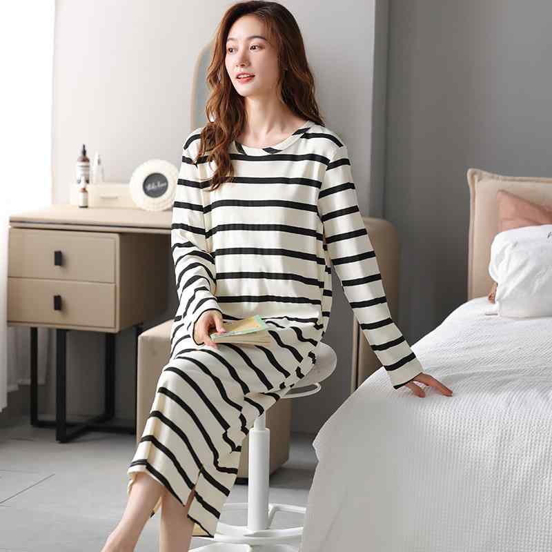 ルームワンピース レディース ラウンドネック 長袖 ストライプ柄 綿 コットン シンプル 韓国風 ロング丈 パジャマ ネグリジェ ルームウェア 部屋着 快適 通気性 伸縮性 ワンマイルウェア おうち時間