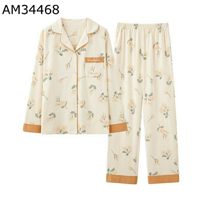 パジャマ レディース 春秋 薄手 綿 長袖 長ズボン マタニティー ルームウェア 上下セット 涼感 前開き ボタン ウエストゴム 通気性 大きいサイズ 茶 黄 白