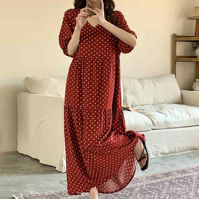 ネグリジェ ワンピース レディース リゾート 旅行 レジャー ピクニック フェミニン フローラル 五分袖 ルームウェア 普段着 おしゃれ ロング丈 Vネック