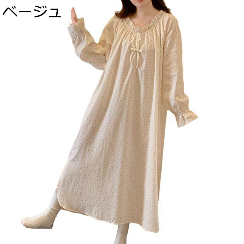 綿100 ネグリジェ 小花柄 ルームワンピース 長袖 レース えりフリル ワンピース 蝶?び 可愛い スイート 姫系 レディース 部屋着 ワンピースパジャ マラウンドネック 敏感肌 快適 吸汗 通気 ソフト