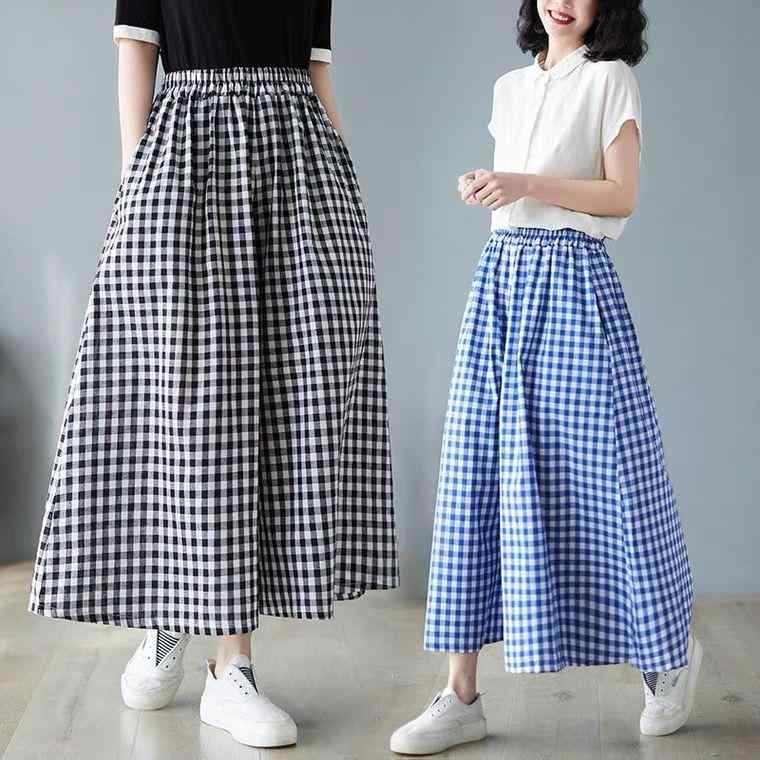 スカート レディース 大きいサイズ ゴムウエスト 綿麻 格子柄 九分丈パンツ ゆったり 体型カバー ワイドレッグパンツ カジュアルパンツ 春夏 薄手 伸縮性
