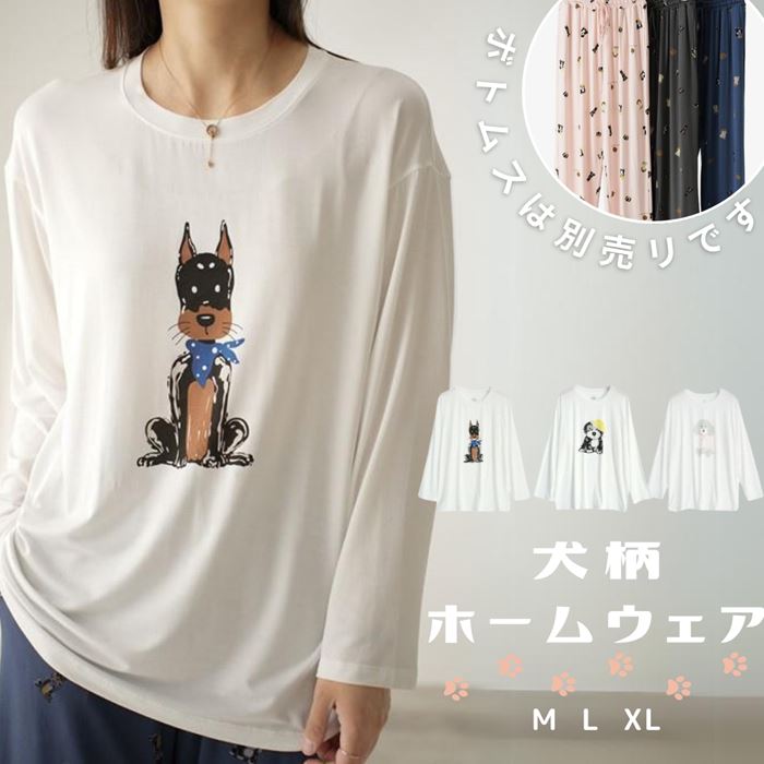 レディース トップス 長袖 パジャマ モーダル ホームウェア 薄手 肌着 犬柄 ワンちゃん 可愛い(トップスだけ)