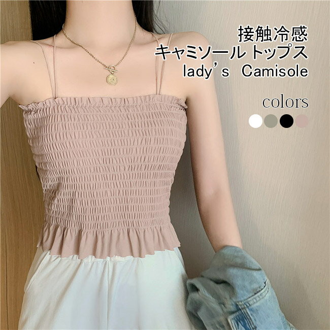 【送料無料】タンクトップ レディース キャミソール 見せインナー 無地 シャーリング フリル カップ付き ノースリーブ バッグクロス オフショルダー 接触冷感 背中みせ トップス カジュアル 可愛い 女性 夏向き ホワイト グリーン ブラック ピンク