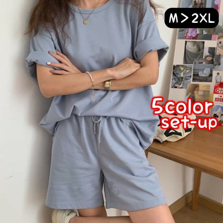 送料無料 セットアップ ルームウェア 上下2点セット 半袖トップス ショートパンツ 短パン レディース 女性 大きいサイズ シンプル おしゃれ かわいい ウエストゴム カジュアル 部屋着 くつろぎウェア ラウンドネック 婦人用